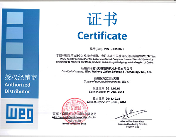 當(dāng)前位置: 首頁 > 榮譽資質(zhì) > 邁騰榮譽資質(zhì)---2014WEG代理授權(quán)證書
