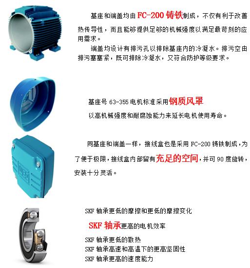 三相異步電機(jī)的機(jī)座由F-200鑄鐵制成,不僅有利于改善熱傳導(dǎo)性,而且能夠提供足夠的機(jī)械強(qiáng)度以滿足苛刻的應(yīng)用需求。為了方便安裝,機(jī)座號112M以上的型號均配有吊環(huán)。